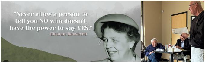 President-elect Blaise led the meeting, beginning with the Pledge of Allegiance, the Rotary four-way test + quote by Eleanor Roosevelt