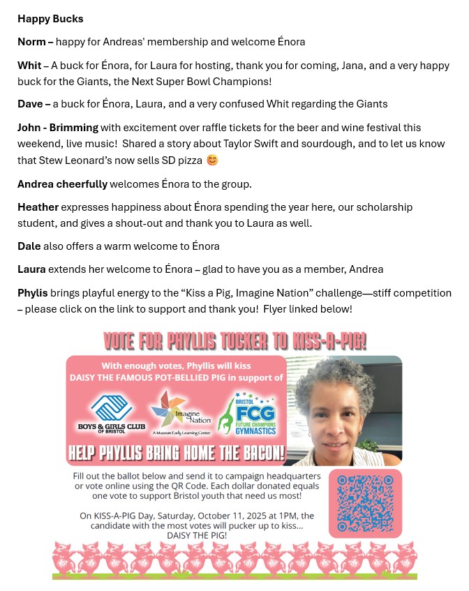 Blaise led the meeting. We begin with the Pledge of Allegiance, the Rotary Four-Way Test, and a quote by Carlos CastaƱeda: "We either make ourselves miserable, or we make ourselves strong." The amount of work is the same.